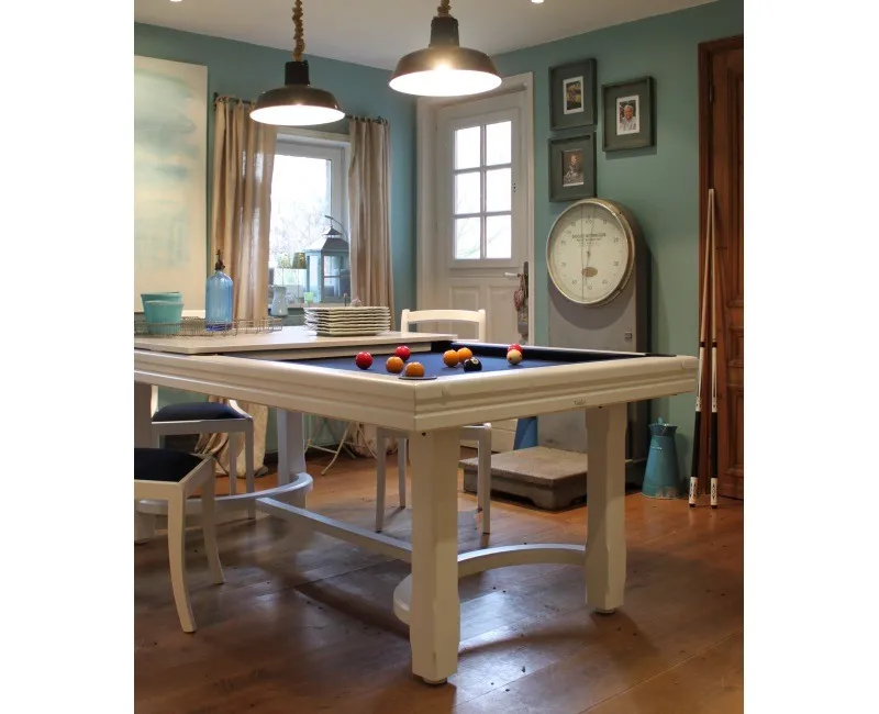 Height from floor to underside of table is 63cms, to top of table is 77cms. This slim table top is what allows this table to work so well as a comfortable diner and provides a perfect pool and snooker table. This is achieved by our unique steel frame which gives the strength needed in this slim section to rigidly support and accurately level the slate; a truly masterful piece of engineering.