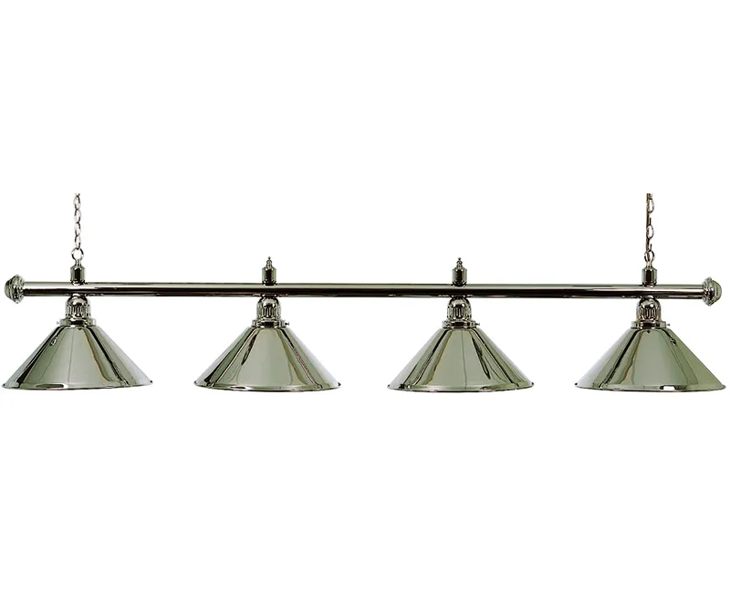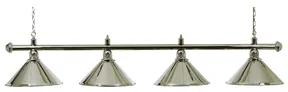 4 Pool lights suspended below a polished brass bar. Features stylized finials to each end of the bar, polished chrome, chain and ceiling roses. The pool light shades are chromedย steel which are durable for even the most demanding pub environments. To maximize down light to the table the internal part of the shade is white enamel to reflect the most available light where its needed. The outside part of the shade is mirror finish polished chrome perfect for a stylishย modern gamesroom setting.
