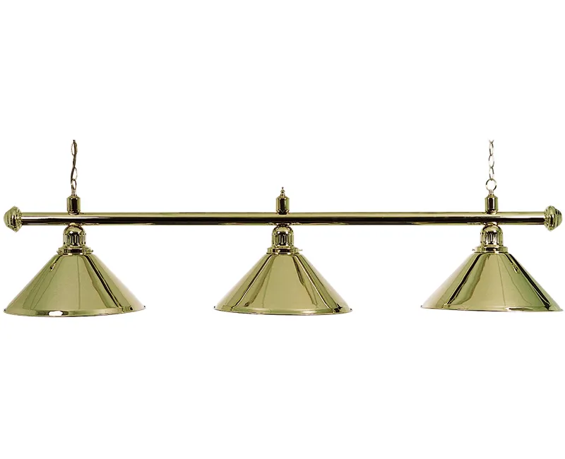 3 Pool lights suspended below a polished brass bar. Features stylized finials to each end of the bar, polished brass, chain and ceiling roses. The pool light shades are enameled steel which are durable for even the most demanding pub environments. To maximize down light to the table the internal part of the shade is white enamel to reflect the most available where its needed. The outside part of the shade is polished brassย to match almost any traditional pool or snooker environment.