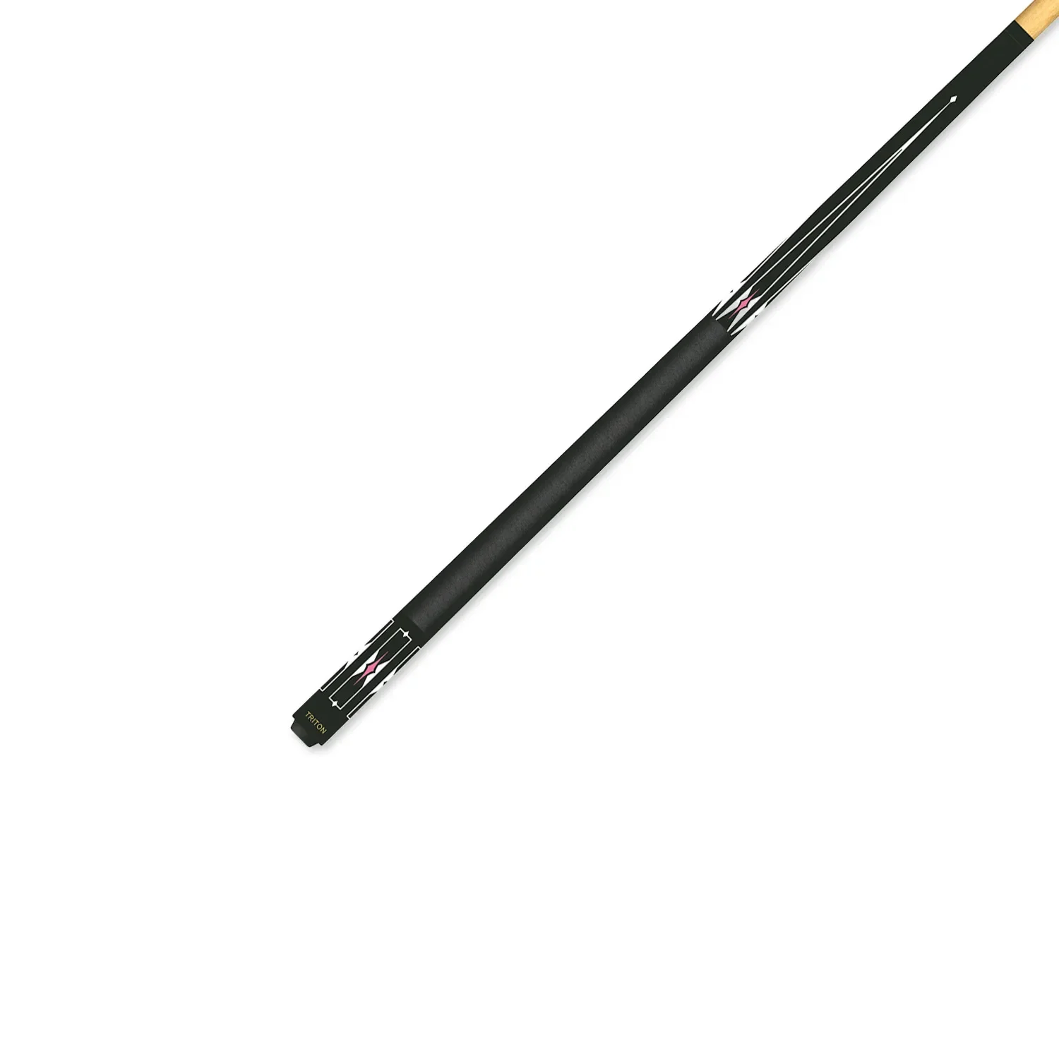 The Triton Target 3 pool cue is an excellent mid-range cue with a black linen grip. The black-painted maple butt features a UV print of white lines with pink details above and below the grip. The two-piece Triton Target pool cue features an 18T brass joint and a 13mm glue-on tip.